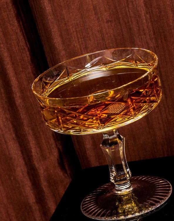 Stir with ice, strain into a cocktail coupe, and garnish with lemon twist oils.