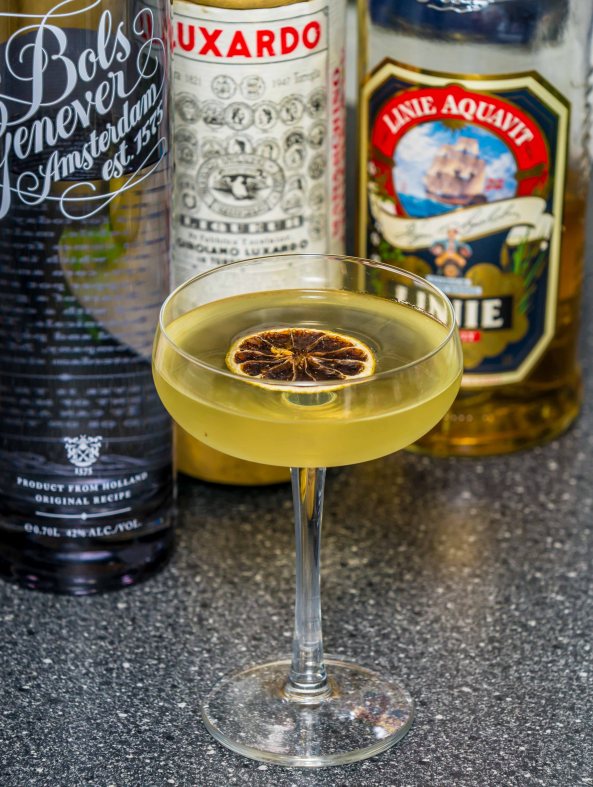 Stir with ice, strain into a cocktail coupe, and garnish with a lemon twist.