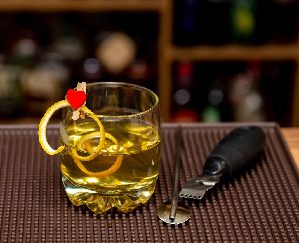 Shake with ice, strain into a cocktail glass, and garnish with a cherry (omit) and orange twist