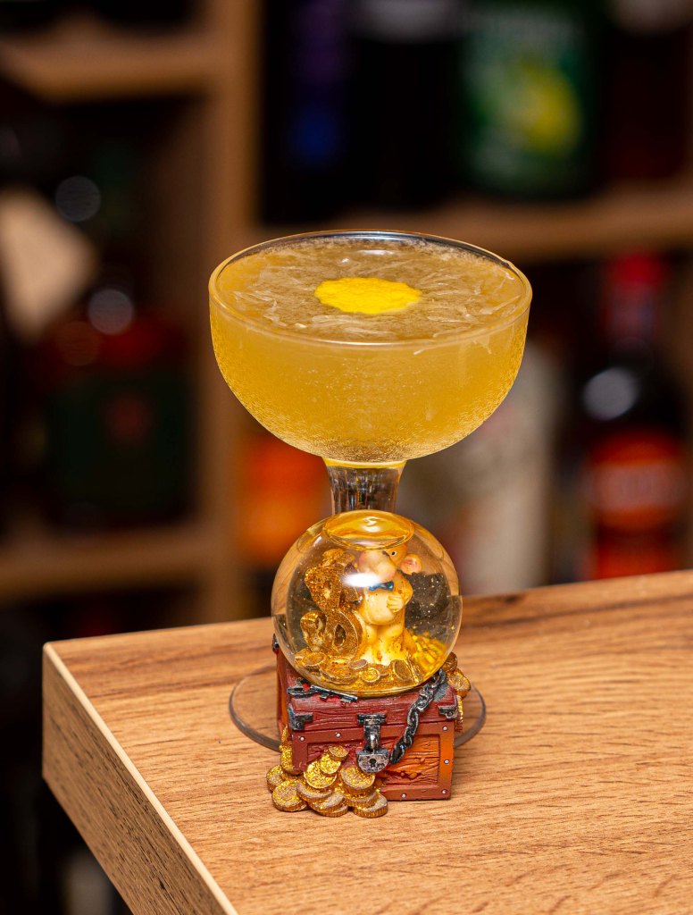 Shake with ice, strain into a sugar-rimmed coupe glass (omit rim), and garnish with a lemon twist.