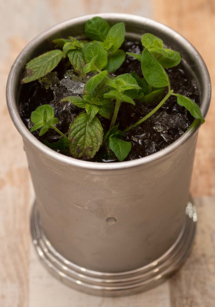 Add ingredients to a Julep cup filled with crushed ice. Stir until frost forms on the outside. Garnish with enough mint to cover the top. Perhaps so much mint that adding a straw becomes a good idea.